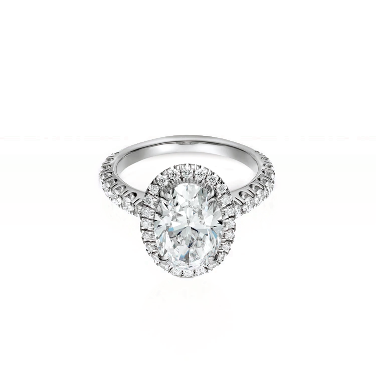 Cartier Destinée Solitaire, platinum 950/1000, set with an oval-cut diamond available from 2.00 to 5.99 carats and set with brilliant-cut pavé diamonds.