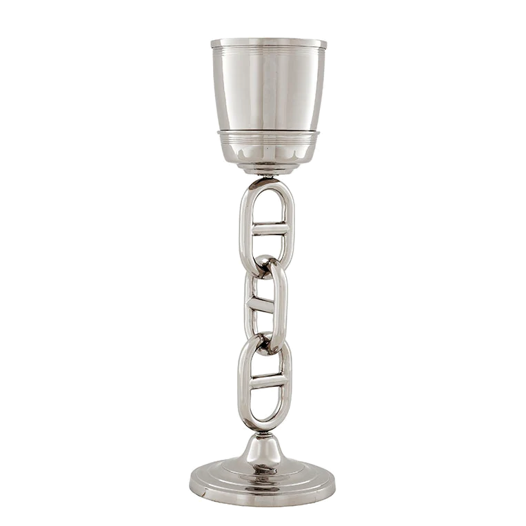 Add a touch of maritime glory to your home décor with the nickel finished Bahamas Wine Cooler with stand. Inspired by anchor chains, this nautical style wine cooler reminds one of cast iron links. Fill the bucket up with ice and a bottle of fine wine or bubbly and set the stand in a prominent place for your guests to enjoy.