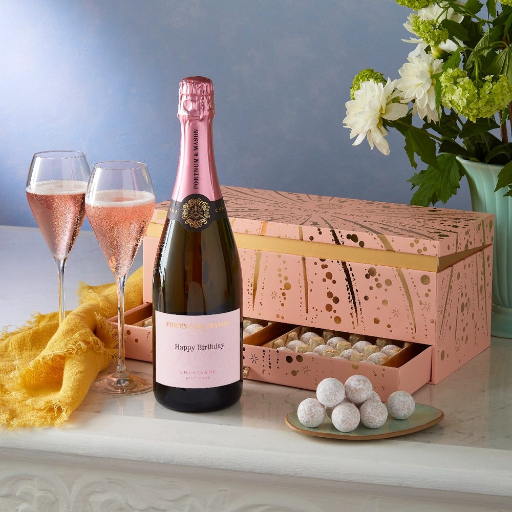 Filled with an unbeatable combination of Pink Marc de Champagne Truffles and Rosé Brut Reserve Champagne, The Rosé Champagne & Chocolate Gift Box is a gift worthy of celebration. Although, the real surprise inside will be the bottle of Fortnum’s Rosé Champagne, personalised with your own message printed on the label.